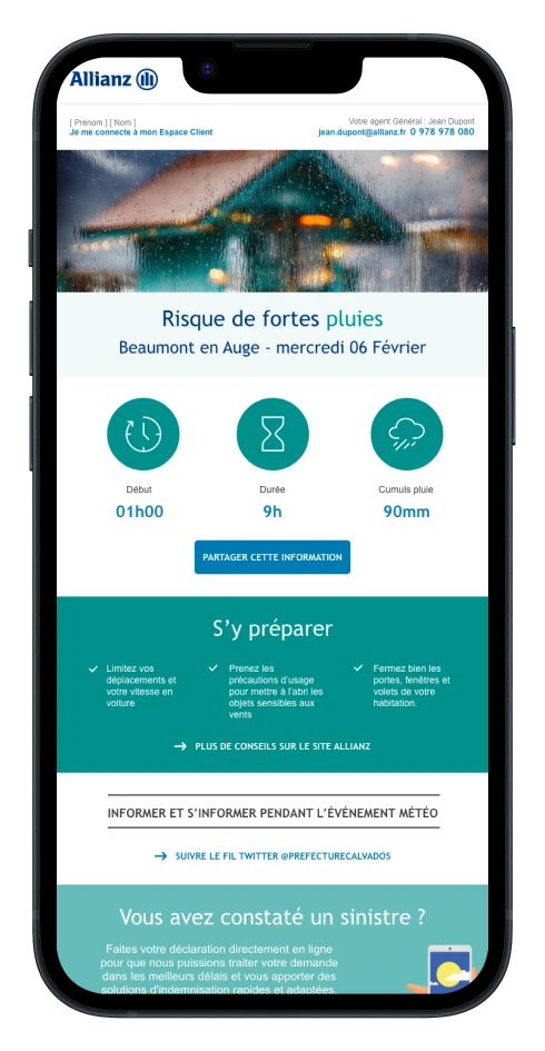 Dans le cadre de ses contrats d’assurance, Allianz offre un service afin de prévenir ses clients des risques météo (pluie, pollutions, fortes chaleurs,…) qu’ils pourraient subir.