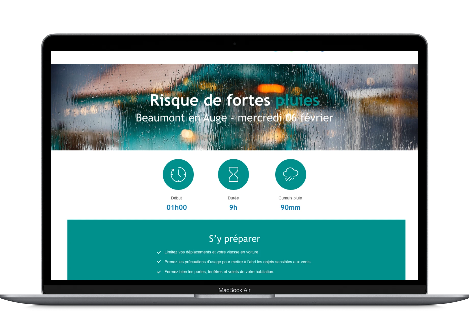 Dans ce cadre nous avons élaboré avec eux un dispositif permettant, grâce à une API d’alerte météo géolocalisés, de prévenir par mail en amont les clients concernés. Ces derniers pouvant par la suite partager l’information avec leurs proches.