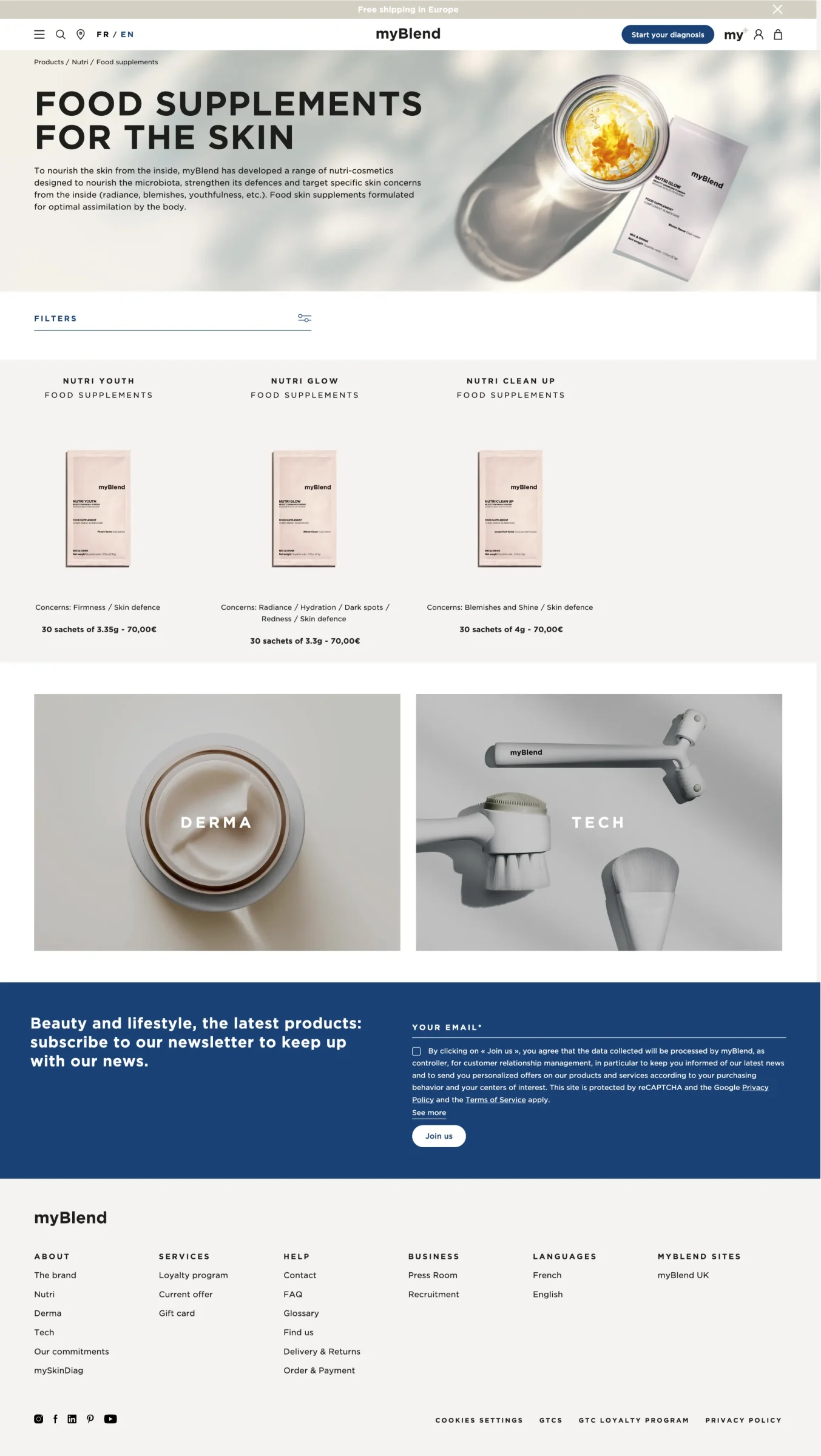 myBlend a confié à Wake Me Up, dans le cadre de sa refonte générale, la création de la plateforme digitale et du site e-commerce. Nous avons réalisé toute la plateforme d’identité digitale de la marque. De plus nous avons mis en place le Design System permettant de générer aisément les différents contenus digitaux nécessaires.